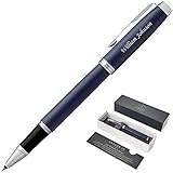 With the Parker IM rollerball pen, you can personalize your custom message or your name up to 25 characters. And it comes with a soft matte blue lacquer finish and also chrome appointments.
